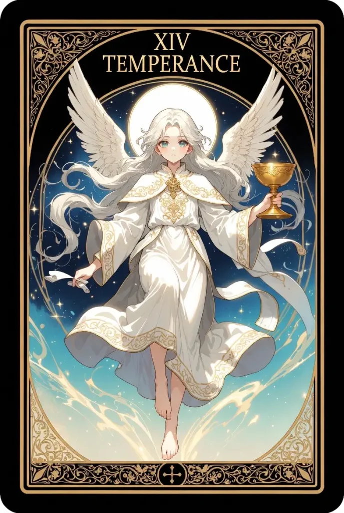 Moderation of all things I what Temperance heralds. Balance between intuition, logic; material, spiritual; work, life. Like the woman imaged, she has one foot in, one foot out of the situation. It allows you to be more discriminative, less emotionally pulled, and observant of signs the universe could be leaving you.