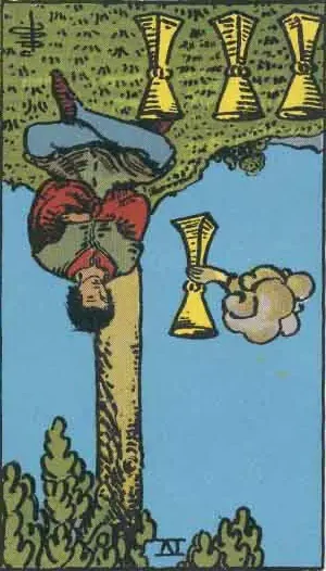 The hand is said to be symbolic of a blessing the universe is offering. But in his displeasure, the man is choosing to sulk over the three chalices instead of seizing the new opportunity.