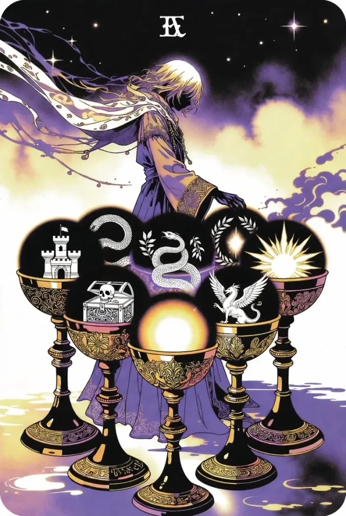 A man stands before seven cups, each brimming with something different. These are all the things he dreams to obtain in this world; that which occupy his idle thoughts. There’s a disembodied head, his ego, the glowing figure covered in a shroud (god) the snake (temptation) the castle (potent ion / security) the gems (wealth) the Laurel (victory) and the dragon (power).