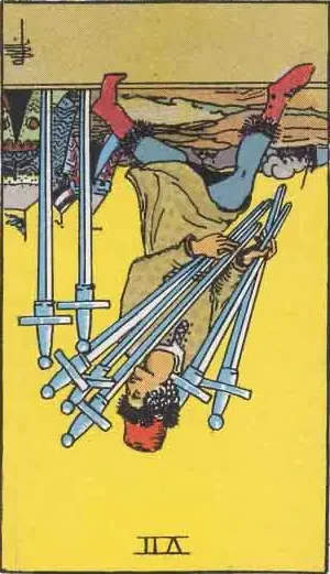 In the reversed position the man depicted in the Seven of Swords kind of seems like he’s about to stumble. At that point he’ll quite literally end up falling on his swords. I’d say his own but the nature of this card being theft, they’re probably someone elses.