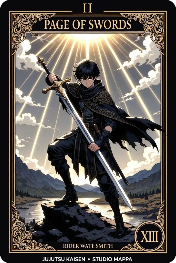 A vigilant youth stands on windy, stormy ground holding an upright sword. Wind-swept clouds and birds in flight emphasize mental alertness, curiosity, sharp communication, and watchfulness (sometimes defensiveness or gossip).