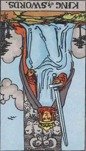 A authoritative king sits on a throne with butterflies and crescent moons. He holds an upright sword; the clear, airy background represents intellectual mastery, logic, justice, strategy, and ethical authority.