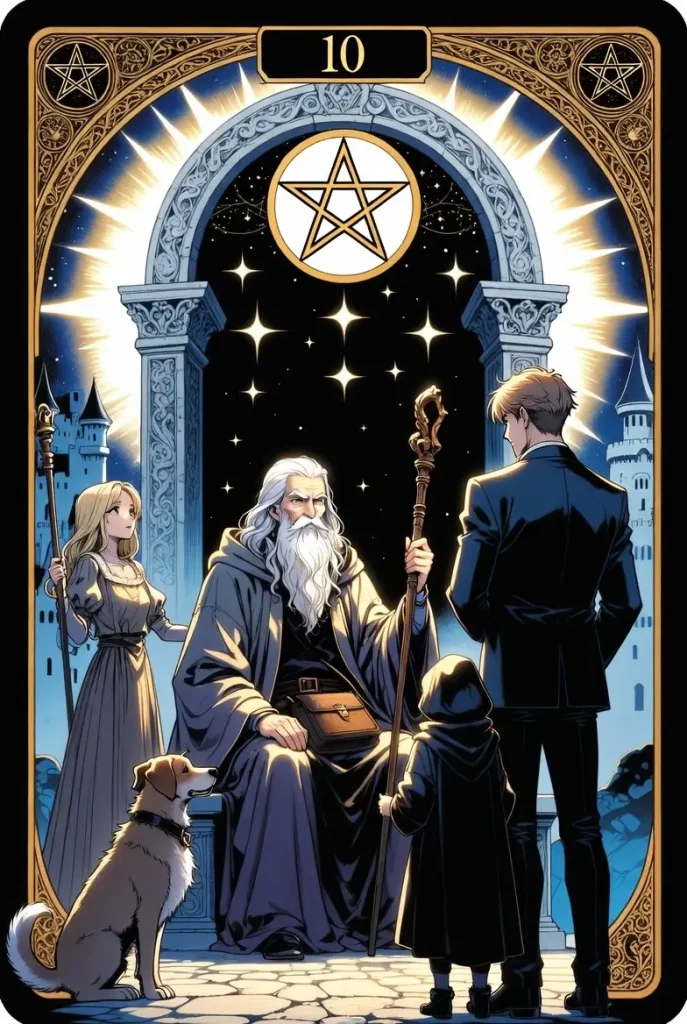 Ten golden pentacles (coins) are arranged in the air in the pattern of the Kabbalistic Tree of Life (the ten Sephiroth), floating above the scene. This mystical arrangement ties material success to spiritual harmony and cosmic order. The setting is lush and prosperous—greenery, vines, and a sense of enduring stability surround the multi-generational family.